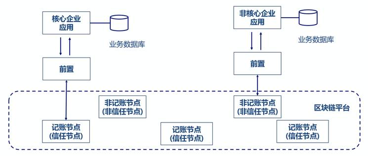 从上述描述就可以理解到,公有链太理想,私有链所处理的问题,传统架构完全能解决,而针对特定业务由企业联盟建立的联盟链,应用方向更清晰,业务价值也更加明确,下图是一个联盟链的示例: