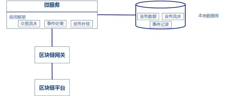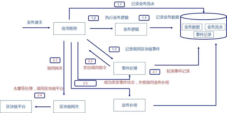 - 应用框架接到请求后首先记录业务流水,然后执行业务逻辑,记录业务数据,最后在事件表中留下对区块链平台调用的记录,事务完成。