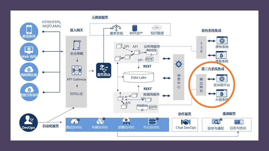 微服务通过区块链网关与区块链平台交互,区块链网关主要功能包括通讯网关、事件监听,同时配合微服务应用框架,完成数据一致性、对账功能。与区块链网关集成的能力,是微服务架构天生具备的。所以我们说微服务与区块链,天生是一对。
