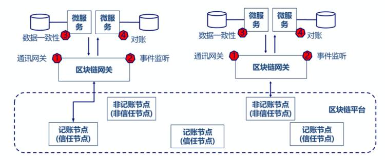 微服务通过区块链网关与区块链平台交互,区块链网关主要功能包括通讯网关、事件监听,同时配合微服务应用框架,完成数据一致性、对账功能。与区块链网关集成的能力,是微服务架构天生具备的。