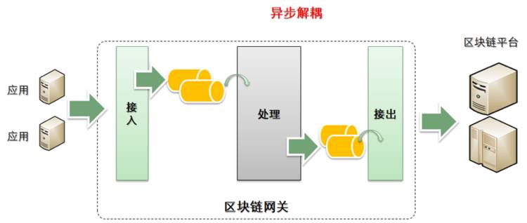 由于区块链平台的服务能力(每秒交易数 TPS)有限,为保证区块链平台的可用性,区块链网关采用了异步处理模式,实现限流、隔离、服务升降级等能力。