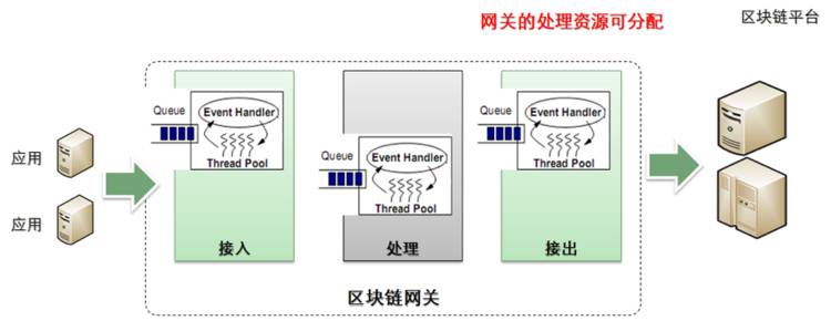区块链网关的内部实现是一个 SEDA 架构(分阶段事件驱动架构),把接入、接出和处理分开(处理主要是记录流水、报文打解包、安全效验等功能),三阶段之间用队列连接,采用异步模拟同步的方式,这是一个用于集成的基础架构。
