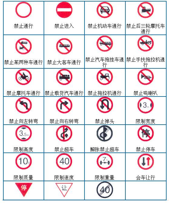 禁令标志:除个别标志外,颜色为白底,红圈,红杠,黑图案,图案压杠;形状为圆形、八角形、顶角朝下的等边三角形。设置在需要禁止或限制车辆、行人交通行为的路段或交叉口附近。