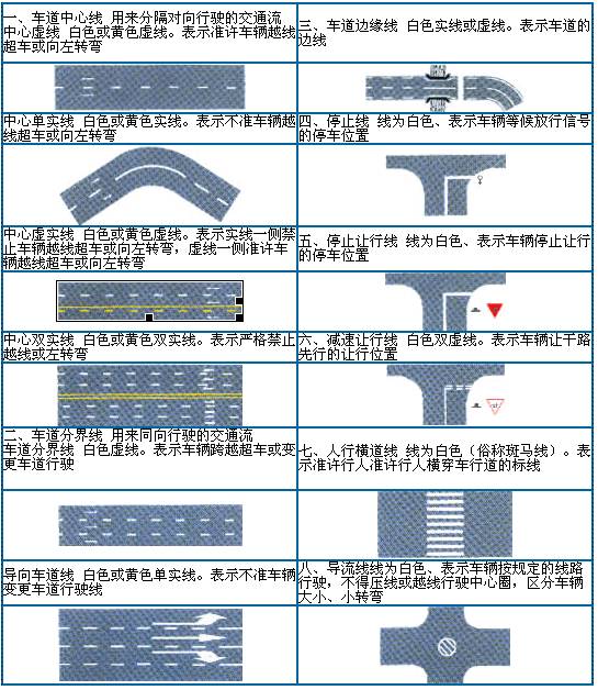 交通标线:在道路的路面上用线条、箭头、文字、立面标记、突起路标和轮廓标等向交通参与者传递引导、限制、警告等交通信息的标识。