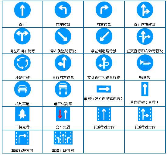 指示标志:颜色为蓝底、白图案;形状分为圆形、长方形和正方形;设置在需要指示车辆、行人行进的路段或交叉口附近。