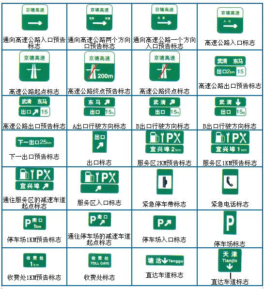 高速公路指示标志:颜色为绿底、白图案;形状除地点识别标志、里程碑、分合流标志外,一般为长方形和正方形。设置在需要传递道路方向、地点、距离信息的路段或交叉口附近。