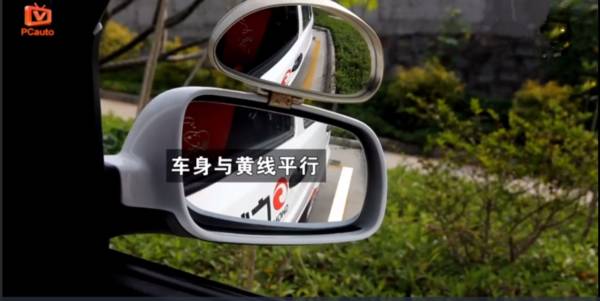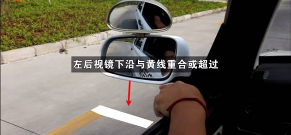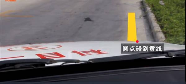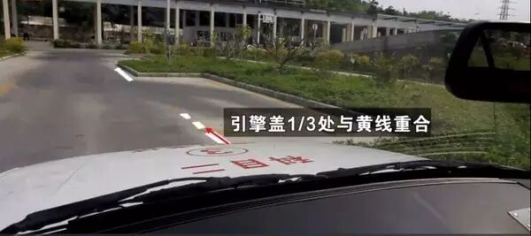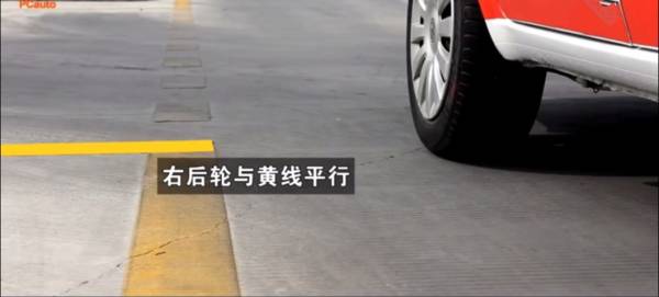 观察左后轮的情况,左后轮即将压到黄色虚线的时候就向左打死方向。